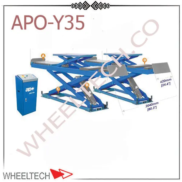دستگاه جک قیچی میزان فرمان Y-35 آپو، بالابری پیشرفته با ظرفیت 3.5 تن است که به‌صورت توکار و روکار طراحی شده و مخصوص تعمیرگاه‌های خودرو جهت تنظیم دقیق فرمان ساخته شده است. این دستگاه مجهز به جک قیچی هیدرولیکی کوچک است که امکان بهره‌برداری آسان و دقیق همراه با دستگاه تنظیم فرمان را فراهم می‌کند.